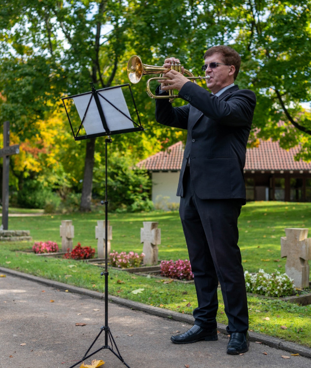 Schon das gemeinsame Singen eines Liedes verbindet die Trauergemeinschaft. Hat der Verstorbene eine bestimmte Musik besonders gemocht oder für seinen Abschied Lieder festgelegt, die gespielt werden sollen, erfüllen wir diesen Wunsch selbstverständlich gerne. Wenn noch keine Trauermusik ausgewählt wurde, stellen wir Ihnen passende Musikstücke aus unserem Repertoire vor. Auch beim Engagement von Live Musikern sind wir Ihnen behilflich. Auf besonderen Wunsch spielt Herr Rolf Heilemann ein ausgesuchtes Stück auf dem Flügelhorn.